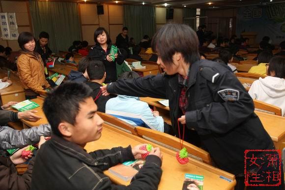 志愿者向群众发放“草莓”环保袋
