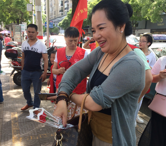 义卖现场,热闹非凡,文体用品、玩具、食品、日用品等各类价廉物美的商品吸引了众多爱心市民前来,醴陵妇联机关干部和义工志愿者们展示宣传板、介绍活动内容、发放宣传资料和环保袋、接待选购顾客,充分展现了醴陵巾帼的美丽风采;可爱的小义工们纷纷用稚嫩的声音叫卖着,为母亲节也增添了温馨与感动。康乃馨作为献给母亲的花,是儿女们对母亲的感谢和祝福,也是这次义卖活动最火热的产品,大家争相购买,收到鲜花的母亲们笑容满面,整个活动现场暖意涌动。