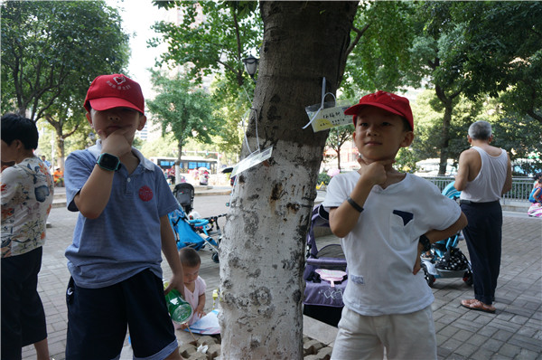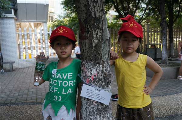 只见孩子们一个个抬起头寻找脑海中记得住的枝叶形状,还踮起脚尖去用力嗅树叶、花朵的香气。在家长的帮助和小伙伴之间的“头脑风暴”过后,孩子们成功地辨别出了杨梅树、桂花树等多种植物。孩子们将认领卡挂在树上,今后他们也将承担起照顾这些树木的责任:看到有人伤害树木要制止,发现有病虫害也要想办法驱逐。