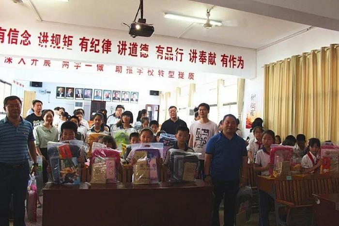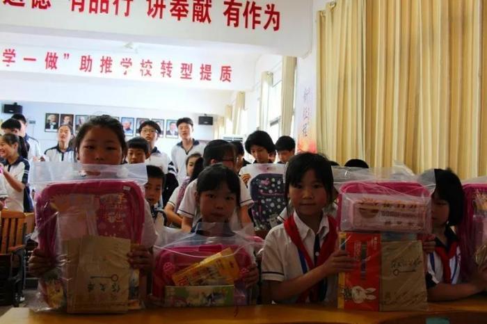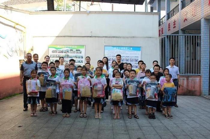 志愿者们分组前往黄沙中学、黄沙小学、珊田小学和清潭小学,现场为贫困家庭孩子和留守儿童发放爱心书包、文具盒、水彩笔、作业本等学习用品。