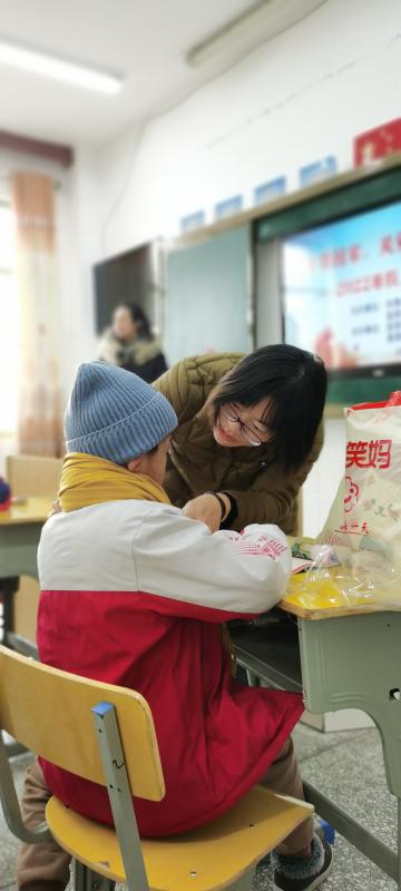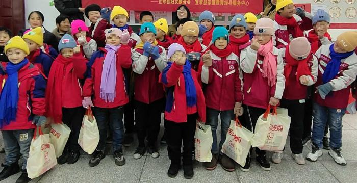 县妇联、团县委及讲师一行分别来到学校5个班级教室,为72名孩子送上精心挑选的帽子、围巾、手套、暖宝宝等“爱心礼包”,并亲手把帽子、围巾、手套给孩子们佩戴好。孩子们见到礼物,个个眉开眼笑,手舞足蹈,嘴里一直喊:“谢谢阿姨!谢谢阿姨!”