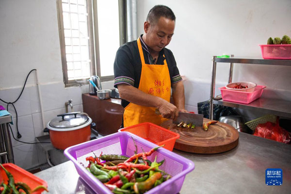 2020年9月17日,在汝城县沙洲瑶族村,朱小红在自家开的农家乐厨房里切菜。新华社记者 陈思汗 摄