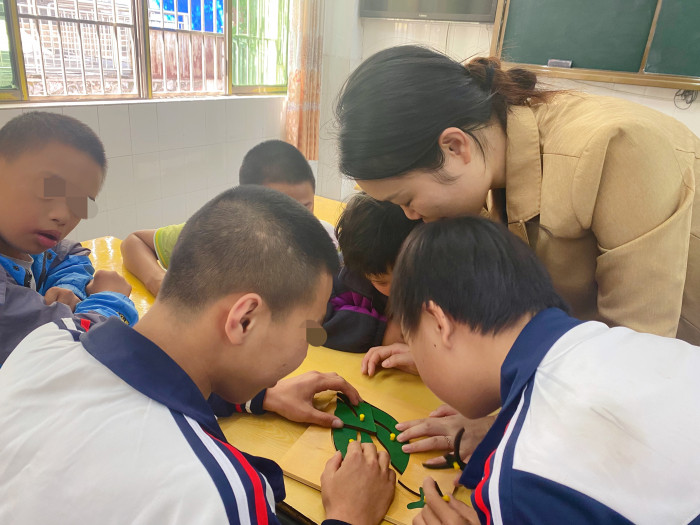 走进宜章县特殊教育学校,孩子们见到熟悉的讲师们分外高兴,没一点陌生感,很快就在讲师们的引导下加入康复训练中。讲师们采取“一对一”“一对多”等方式,分别与孩子们一起做蛋炒饭、一起玩传球、一起拼积木、一起制作手工,一起做手指游戏等,孩子们也都积极配合,玩得不亦乐乎。活动在一定程度上培养了孩子们的兴趣爱好,促进孩子们思想信念的茁壮成长。在手工制品的教学中,讲师们还教孩子们辨别颜色和身体的各个部位、发出声音、矫正说话错误等,并鼓励他们好好学习、好好生活,讲师们沉浸式的陪伴让孩子们倍感温暖。
