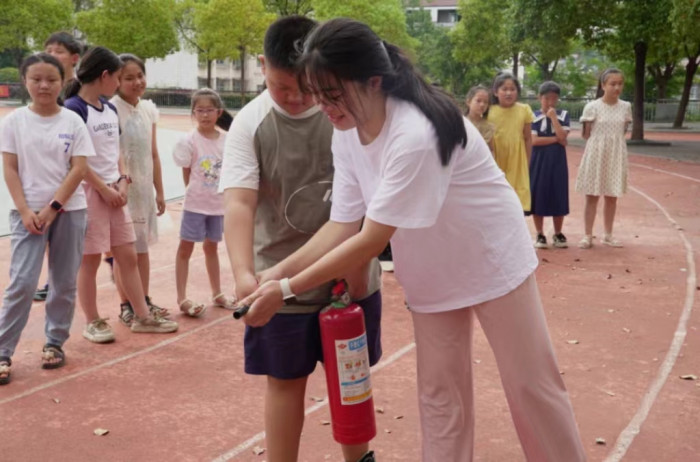 课堂上,志愿者用通俗易懂的语言,以案说法,将防溺水、交通安全等重要知识传授给孩子们。假期,溪边和河边成了孩子们向往的地方,志愿者们提醒游玩一定要有大人看护,切不可在不熟悉的水域冒险戏水,远离深水区。而在暑期出行时,要遵守交通规则,还是乘坐交通工具要做好安全防护措施。采取“讲-问-答”的形式,为学生讲解交通安全知识。实操中,工作人员以心肺复苏为例,从按压手势、按压位置、注意事项等多个方面进行全方位的讲解。队员们还带领大家了解消防器材、消防标识和消防救援常识,通过假设特定的危险场景进行模拟演练,学生们积极参与,达到演练效果。