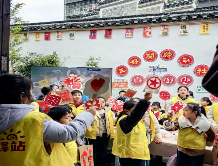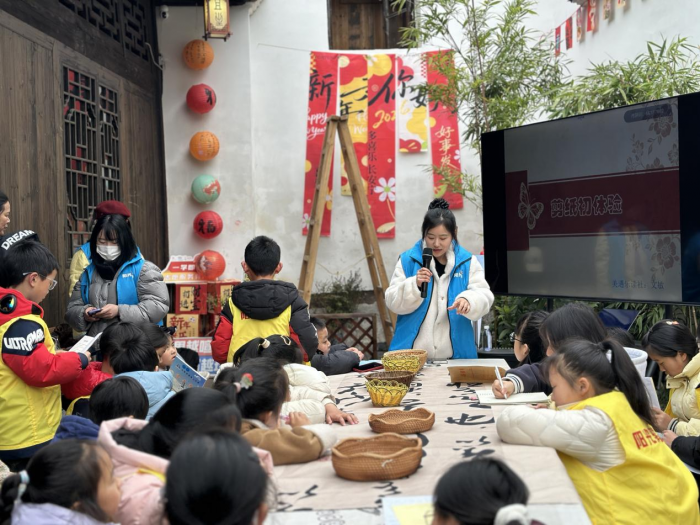 开营仪式上,高校志愿者们以及“暖心姐姐”将全程陪伴学员阅读,分享学习经验与成长感悟,以青春力量温暖童心。随后孩子们在图书室自主选书静读,沉浸书香;非遗剪纸课堂上,老师讲解文化底蕴、展示佳作,孩子们动手剪出圆形、爱心、金元宝等造型。有孩子分享,自己不仅学会剪纸,全程都倍感开心,登台分享时虽腼腆,心底却满是快乐与自豪,阅读与非遗体验的美好初见就此拉开。